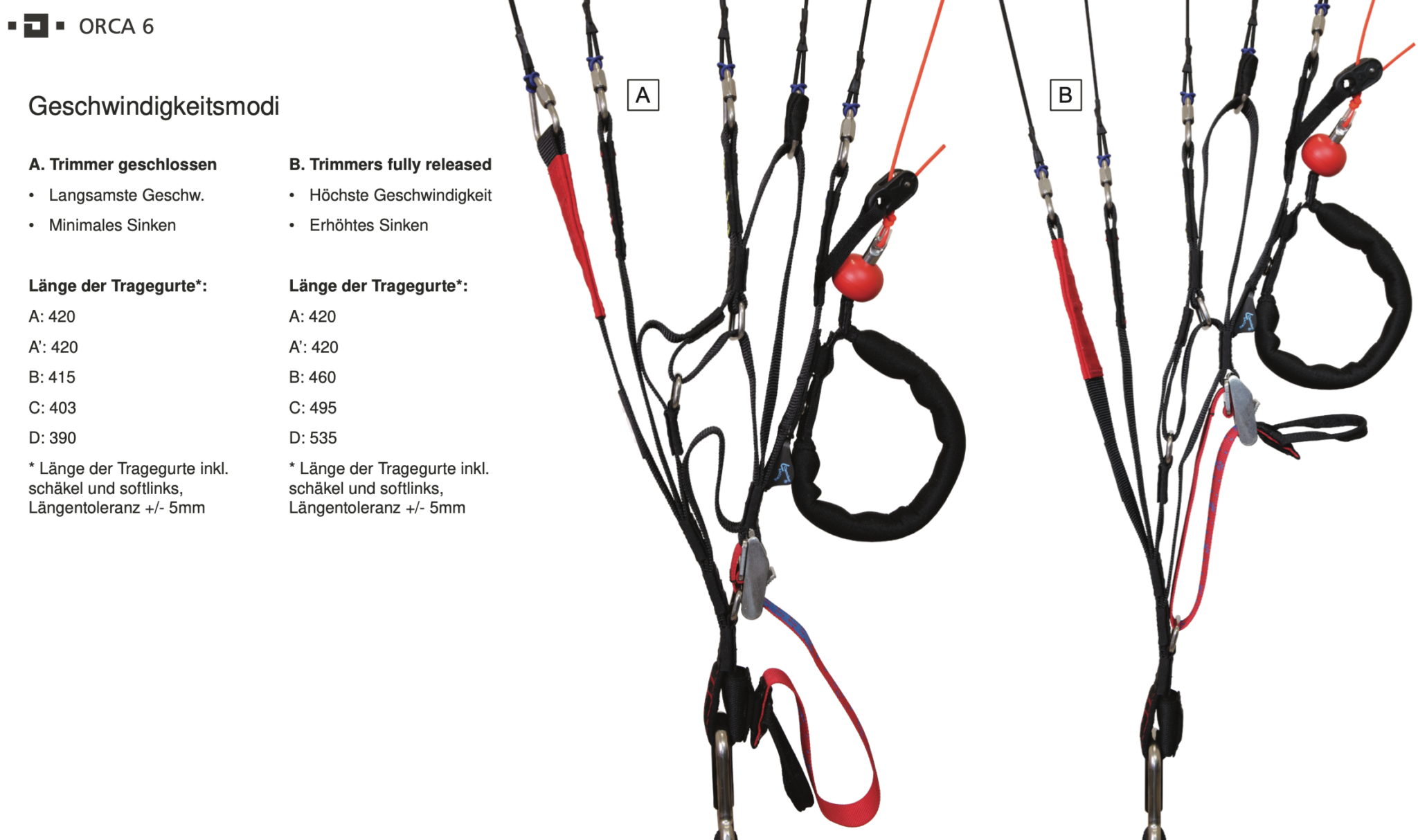 Die effizienten Trimmer verfügen einen grossen Weg und wollen im Flug aktiv gebraucht werden. Der Orca 6 wird dadurch zu einem wirklich sehr leistungsfähigen Gleitschirm der Pilot und Passagier viel Freude bereitet.